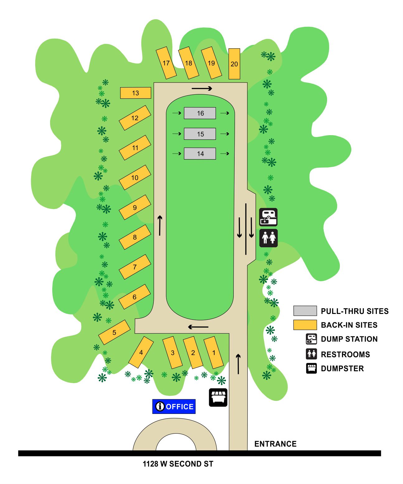 Campground Entrance: 1100 W. Second St